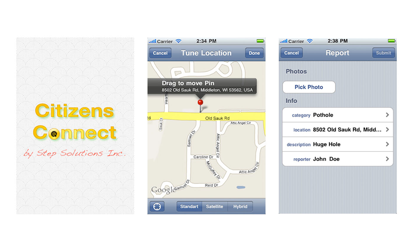 Приложение для iOS, позволяющее гражданам сообщать властям города о проблемах в городском хозяйстве (включая фотографии, геолокационные данные, описание) с помощью мобильного устройства, и отслеживать состояние сообщения на специальном веб-сайте.